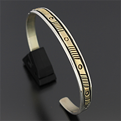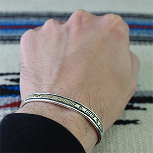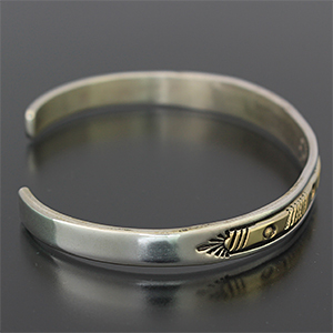 | NAVAJO/ナバホ族のアーティスト Bruce Morgan/ブルース・モーガンに制作を依頼したバングルです。 シンプルながらも深く正確なスタンプワーク、こちらはRIVER MAIL別注による斜めライン/サークルになります。 センターラインは14Kを使用しているため高級感があり、スタイルを選びませんので様々な場面でお使い頂けます。 単体でも他のバングルとの重ね着けにも相性良くお楽しみ頂けます。 | ||