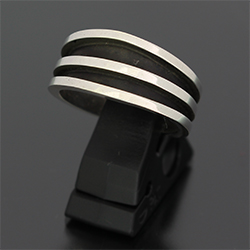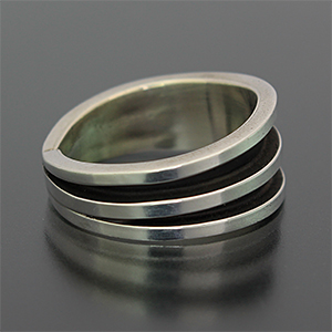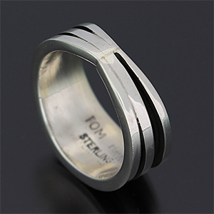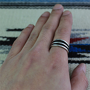 | NAVAJO/ナバホ族のアーティスト Tom Hawk/トム・ホークが制作した3ラインのリングです。 銀と黒のコントラストが際立つ、シンプルでスタイルを問わない作品です。 ボトム部分はテーパーが付いていますので、指の曲げ伸ばしも違和感なく心地よい装着感が感じられます。 美しいラインが印象的で、どなたでもお楽しみ頂けるリングです。 | ||