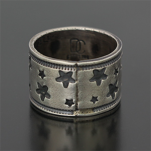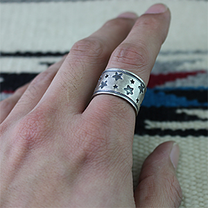 | NAVAJO/ナバホ族のアーティスト Derrick Cadman/デリック・キャドマンに制作を依頼したリングです。 スターのスタンプがランダムに打ち込まれたストレートタイプです。 艶消しの風合いのある作品で、カジュアルにお使い頂ける作品です。 | ||