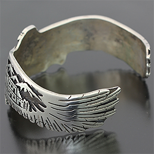 | HOPI/ホピ族のアーティスト Jason Takala/ジェイソン・タカラに制作を依頼をしたバングルです。 イーグルに包み込まれるスタイルのRIVER MAIL別注による作品です。 センターは定番の14Kメイズ、繊細な作りは変わらず装着感の良いバングルです。 | ||