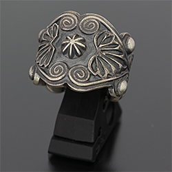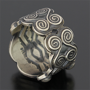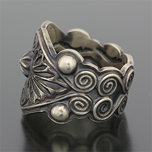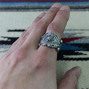 | NAVAJO/ナバホ族のアーティスト Sunshine Reeves/サンシャイン・リーブスに制作を依頼したリングです。 周りを縁取るようにワイヤーワークで仕上げて頂いています。 鈍い光沢と燻しが効果的で、裏側にはスタンプが全面に施されています。 使い込むほどに味わいが増す作品です。 | ||