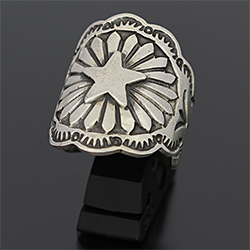 | NAVAJO/ナバホ族のアーティスト Sunshine Reeves/サンシャイン・リーブスに制作を依頼したリングです。 アップリケによるスターが印象的で、指を包み込むようなスタイルの作品です。 テーパーが付いていますので指の曲げ伸ばしも違和感を感じることなく装着感の良いリングです。 | ||