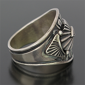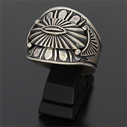 | NAVAJO/ナバホ族のアーティスト Derrick Gordon/デリック・ゴードンに制作を依頼したリングです。 アップリケによるサンバーストデザインです。重厚感のあるナバホジュエリーらしさがあります。 テーパーが付いていますので指の曲げ伸ばしも違和感を感じることなく装着感の良いリングです。 | ||