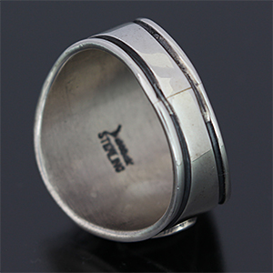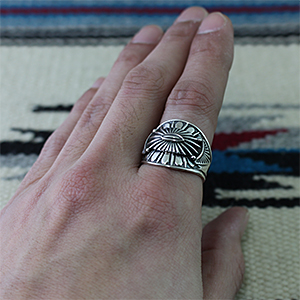 | NAVAJO/ナバホ族のアーティスト Derrick Gordon/デリック・ゴードンに制作を依頼したリングです。 アップリケによるサンバーストデザインです。重厚感のあるナバホジュエリーらしさがあります。 テーパーが付いていますので指の曲げ伸ばしも違和感を感じることなく装着感の良いリングです。 | ||