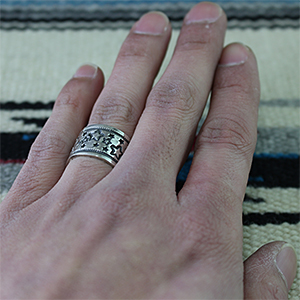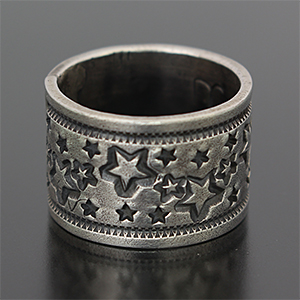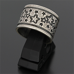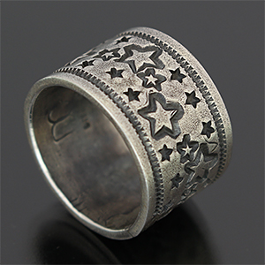 | NAVAJO/ナバホ族のアーティスト Derrick Cadman/デリック・キャドマンに制作を依頼したリングです。 スターのスタンプがランダムに打ち込まれたストレートタイプです。 艶消しの風合いのある作品で、カジュアルにお使い頂ける作品です。 | ||