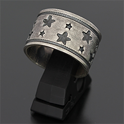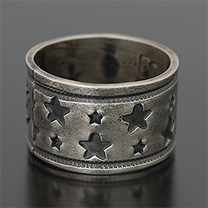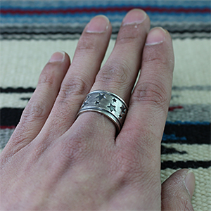 | NAVAJO/ナバホ族のアーティスト Derrick Cadman/デリック・キャドマンに制作を依頼したリングです。 スターのスタンプがランダムに打ち込まれたストレートタイプです。 艶消しの風合いのある作品で、カジュアルにお使い頂ける作品です。 | ||