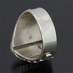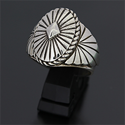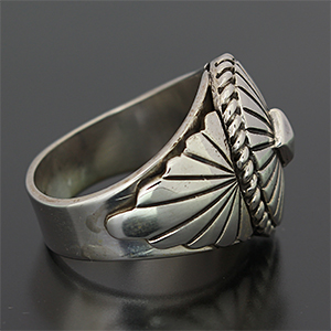 | NAVAJO/ナバホ族のアーティスト Delbert Vandever/デルバート・バンデバーに制作を依頼をしたリングです。 オーバル型のサンバーストデザインです。両サイドはアップリケで仕上がっています。 テーパーが付いていますので指の曲げ伸ばしも違和感を感じることなく装着感の良いリングです。 | ||