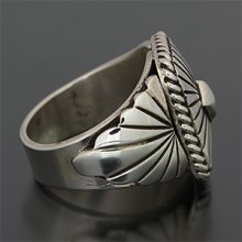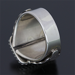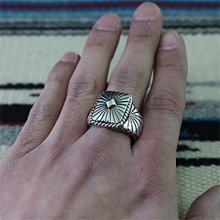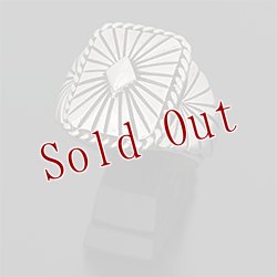 | NAVAJO/ナバホ族のアーティスト Delbert Vandever/デルバート・バンデバーに制作を依頼をしたリングです。 スクエア型のサンバーストデザインです。両サイドはアップリケで仕上がっています。 テーパーが付いていますので指の曲げ伸ばしも違和感を感じることなく装着感の良いリングです。 | ||