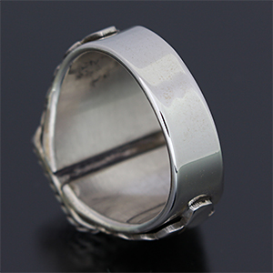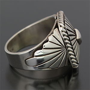 | NAVAJO/ナバホ族のアーティスト Delbert Vandever/デルバート・バンデバーに制作を依頼をしたリングです。 オーバル型のサンバーストデザインです。両サイドはアップリケで仕上がっています。 テーパーが付いていますので指の曲げ伸ばしも違和感を感じることなく装着感の良いリングです。 | ||