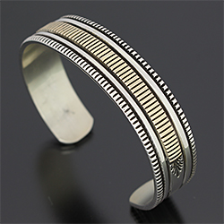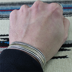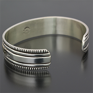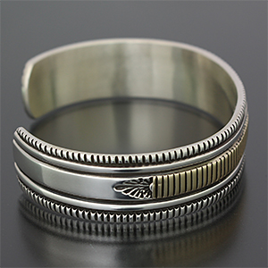 | NAVAJO/ナバホ族のアーティスト Bruce Morgan/ブルース・モーガンに制作を依頼したバングルです。 シンプルながらも深く正確なスタンプワーク、こちらはRIVER MAIL別注デザインになります。 センターラインは14Kを使用しているため高級感があり、スタイルを選びませんので様々な場面でお使い頂けます。 単体でも他のバングルとの重ね着けにも相性良くお楽しみ頂けます。 | ||