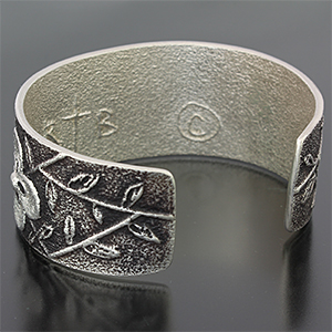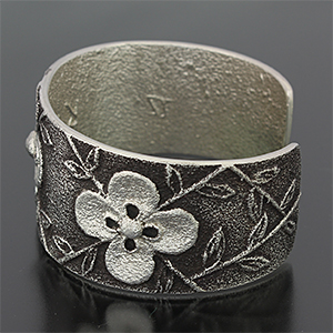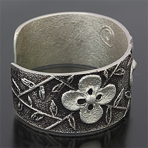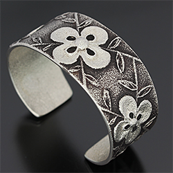 | Darryl Begayの奥様でもあるRebecca Begay/レベッカ・ビゲイに制作を依頼したバングルです。 レベッカの世界観がしっかりと表現された女性らしいフラワーデザインは、Darryl Begayと同様トゥーファーキャストによるものです。 グレーとブラックの強弱の効いたコントラストは作品全体を引き立てます。 | ||