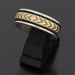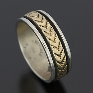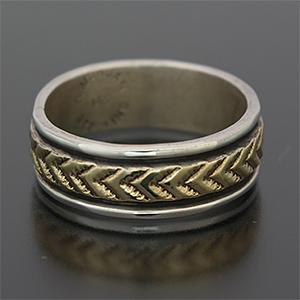 | NAVAJO/ナバホ族のアーティスト Bruce Morgan/ブルース・モーガンに制作依頼をしたリングです。 シンプルながらも深く正確なスタンプワーク、デザインはRIVER MAIL別注による1ダイヤ+アローになります。 センターは14Kを使用しているため高級感があり、スタイルを選びませんので様々な場面でお使い頂けます。 他のリングとの相性も抜群です。 | ||