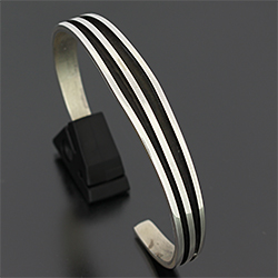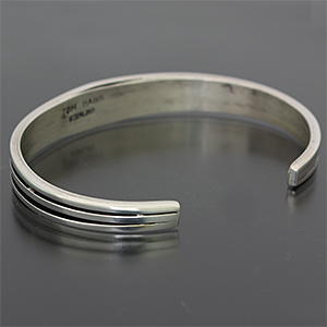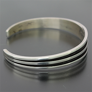 | NAVAJO/ナバホ族のアーティスト Tom Hawkが制作した3ラインのバングルです。 銀と黒のコントラストが際立つ、シンプルでスタイルを問わないテーパータイプです。 美しいラインが印象的で、どなたでもお楽しみ頂ける作品です。 | ||
