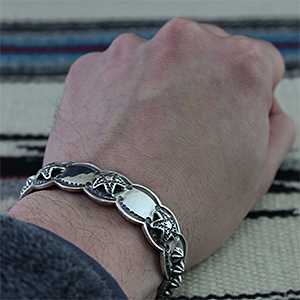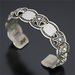| NAVAJO/ナバホ族のアーティスト Sunshine Reeves/サンシャイン・リーブスに制作を依頼したバングルです。 アップリケによるスターとコンチョが印象的な作品です。全面にスタンプワークが施されており、力強い雰囲気が特徴です。スターは丸みを帯びているため立体感があります。 ポップな作品に独特の味わいも感じられ、男性的で武骨な印象を備えたバングルです。 | ||