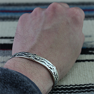| NAVAJO/ナバホ族のアーティスト Sunshine Reeves/サンシャイン・リーブスに制作を依頼したバングルです。 アップリケによるサンダーバートが印象的な作品です。全面にスタンプワークが施されており、力強い雰囲気が特徴です。 ポップな作品に独特の味わいも感じられ、男性的で武骨な印象を備えたバングルです。 | ||