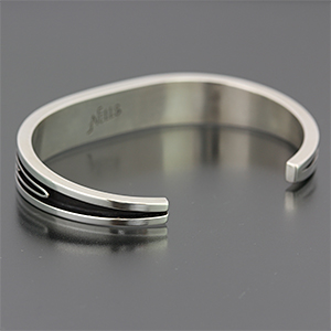 | NAVAJO/ナバホ族のアーティスト Albert Nells/アルバート・ネルスに制作を依頼したバングルです。 ワンポイントでジェットを使用してのオーダーですが、作品を引締める意味合いでもバランス良く仕上がりました。 オーバーレイによる奥行きのある表情は、高いクオリティーと共に大人のジュエリーを感じさせる風格があります。 シックで無駄のない造形美、テーパー付きとなります。 | ||