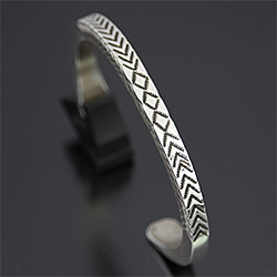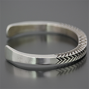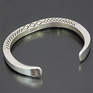 | NAVAJO/ナバホ族のアーティスト Bruce Morgan/ブルース・モーガンに制作を依頼したバングルです。 RIVER MAILの別注から生まれた#3スクエアワイヤー(約5.5mm厚)による作品です。3面にデザインをして頂いた作品ですが、ブルースの良さはそのまま引き継がれています。 スタイルを選ばない着けやすさはそのままで、一点でも重ねてでも楽しめる作品です。 | ||