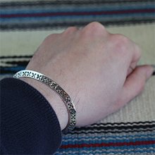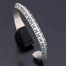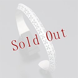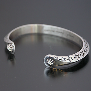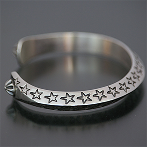 | NAVAJO/ナバホ族のアーティスト Sunshine Reeves/サンシャイン・リーブスに制作を依頼したバングルです。 RIVER MAIL別注トライアングルワイヤーでのオーダーです。美しい光沢が印象的な鏡面仕上げです。 デザインはアロー/スターで、エンドにコンチョを付けて頂きました。 単体でも重ね着けにも重宝するアイテムです。 | ||