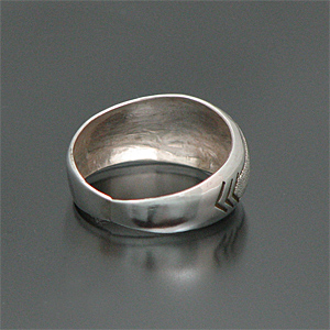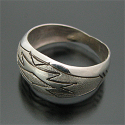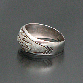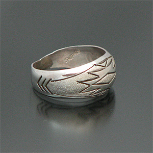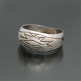 | NAVAJO/ナバホ族のアーティスト Zane Taheが制作したリングです。 人気のナバホラグ柄がデザインされており、ザラザラとブラシ仕上げでくっきりとラグ柄が表現されています! シンプルな仕上がりで、非常にスタイリングしやすいアイテムでございます♪ | ||