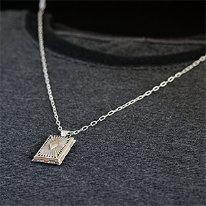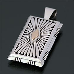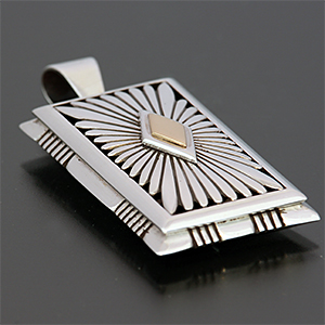 | NAVAJO/ナバホ族のアーティスト Howard Nelson/ハワード・ネルソンに制作を依頼したペンダントです。 3段構造で仕上げて頂いたサンバーストデザインです。ダイヤ型のパーツは14Kとシルバーの組合せになります。 内側はシャドウボックスによる空洞で奥行きのあるスタイルが特徴です。また、中央に向かってゆるいドーム状に膨らんでいるため立体感も得られています。 長方形のシャープな印象を与えてくるフォルムです。 | ||