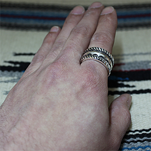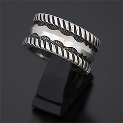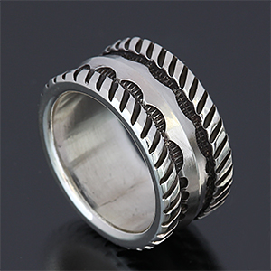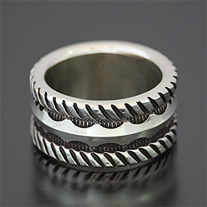 | NAVAJO/ナバホ族のアーティスト Clendon Pete/クレンドン・ピートに制作を依頼したリングです。 クラシックスタイルのチゼルワークリングです。断面はファイルワークによる三角形になっているため立体感が得られています。 また、三角形部分にスタンプが効果的に打たれているのもクレンドンの作品の特徴で、9ゲージ(約2.9mm)のシルバーシートを使用しているため重厚感も兼ね備えています。 シンプルで完成度の高いリングです。 | ||