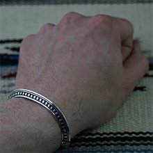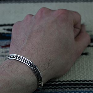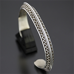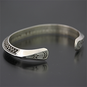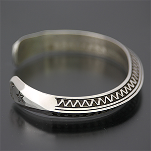 | NAVAJO/ナバホ族のアーティスト Wylie Secatero/ワイル・セカテロが制作したバングルです。 トライアングルワイヤーを用いて独自のスタンプが施されています。 スタンプを打つ時には反対側は見えませんので、バランスを考えながらスタンピングをしていきます。 スタイルを選ばない着けやすさはもちろん、インディアンジュエリーが初めての方でも気軽にお楽しみ頂けます。 | ||