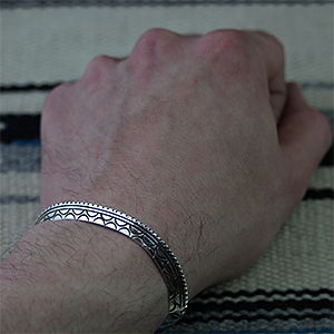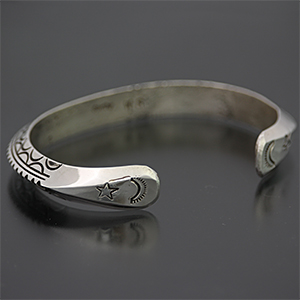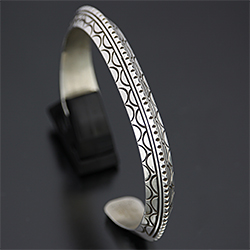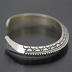 | NAVAJO/ナバホ族のアーティスト Wylie Secatero/ワイル・セカテロが制作したバングルです。 トライアングルワイヤーを用いて独自のスタンプが施されています。 スタンプを打つ時には反対側は見えませんので、バランスを考えながらスタンピングをしていきます。 スタイルを選ばない着けやすさはもちろん、インディアンジュエリーが初めての方でも気軽にお楽しみ頂けます。 | ||