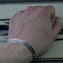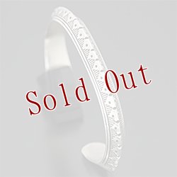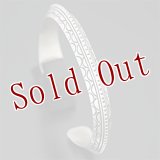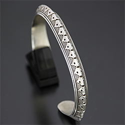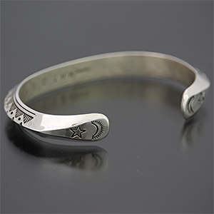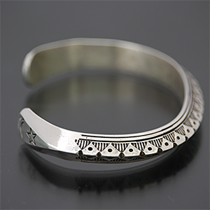 | NAVAJO/ナバホ族のアーティスト Wylie Secatero/ワイル・セカテロが制作したバングルです。 トライアングルワイヤーを用いて独自のスタンプが施されています。 スタンプを打つ時には反対側は見えませんので、バランスを考えながらスタンピングをしていきます。 スタイルを選ばない着けやすさはもちろん、インディアンジュエリーが初めての方でも気軽にお楽しみ頂けます。 | ||
