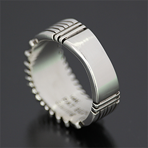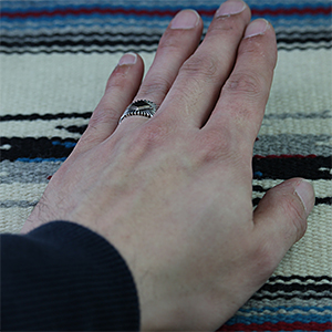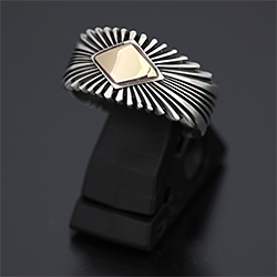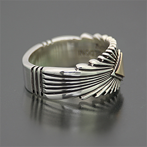 | NAVAJO/ナバホ族の女性アーティスト Patricia Bedonie/パトリシア・べドニーに制作依頼をしたリングです。 変わらず正確で美しいチゼルワークによるサンバーストデザインです。 ダイヤ型のパーツは14Kとシルバーのダブルダイヤモンドで仕上げて頂いています。 側面は凹凸が鋭いエッジが効いており、形状はテーパーになっているため指あたりがとてもよく、装着感の良いリングです。 | ||