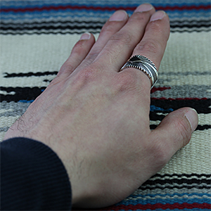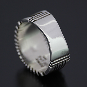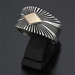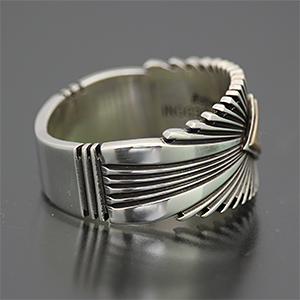 | NAVAJO/ナバホ族の女性アーティスト Patricia Bedonie/パトリシア・べドニーに制作依頼をしたリングです。 変わらず正確で美しいチゼルワークによるサンバーストデザインです。 ダイヤ型のパーツは14Kとシルバーのダブルダイヤモンドで仕上げて頂いています。 側面は凹凸が鋭いエッジが効いており、形状はテーパーになっているため指あたりがとてもよく、装着感の良いリングです。 | ||