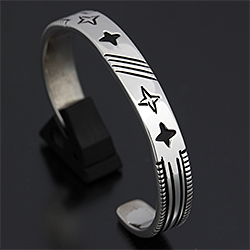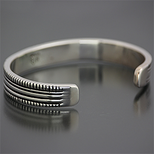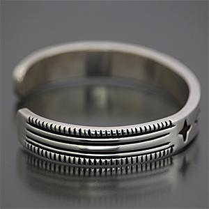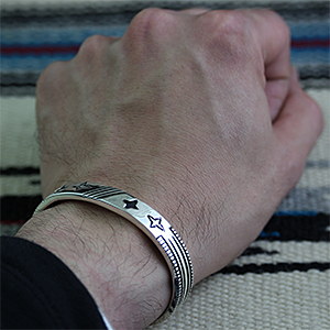 | NAVAJO/ナバホ族のアーティスト Steven J. Begay/スティーブン・J・ビゲイに制作を依頼をしたバングルです。 重厚感のある輝きに強いコントラストが最大の魅力、別注デザインによる作品です。 オーバレイによって洗練されたデザインは、手作りの良さを感じ、柔らかい着け心地はいつも身に着けていたいと思わせてくれます。 単体でも重ね着けでもしっかりと際立つ作品です。 | ||