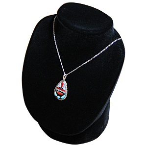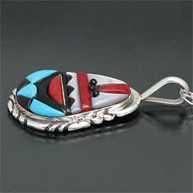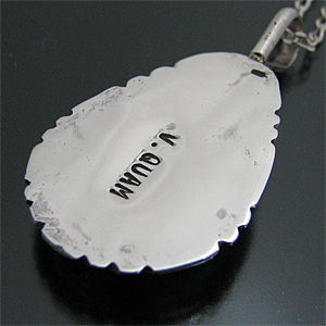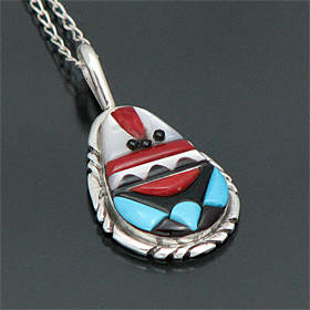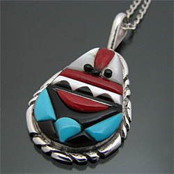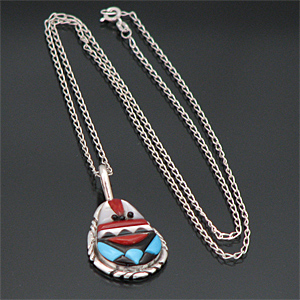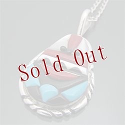 | ZUNI/ズニ族の人気アーティスト Varginia Quam/バージニア・クアムが制作したネックレスです。 カッティングを施した石をはめ込んで図柄を完成させる技法インレイで制作されており、素材を活かした作品はその技術はさることながら、立体的に仕上げられたストーン、そしてアーティストの個性が存分に発揮された素晴らしい作品に仕上がっております! 存在感のある大きさに、独特のカラーで組み合わされたセンスのあるペンダントです! | ||