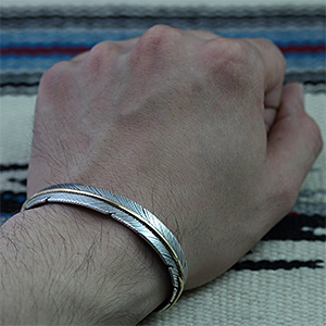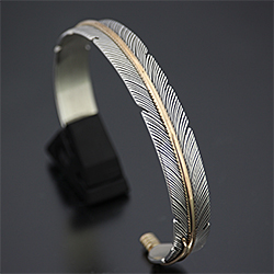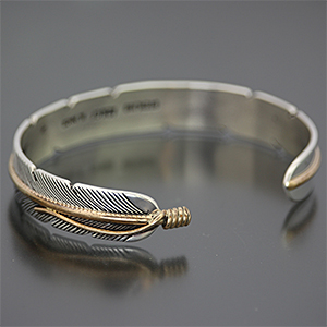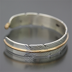 | NAVAJO/ナバホ族のアーティスト Harvey Mace/ハーヴィー・メイスに制作を依頼したバングルです。 センターラインには12KGF(12金張り)が施されている、躍動感のあるフェザーモチーフの作品です。 美しい曲線と共にフェザーがしっかりとデザインされていますので、どなたでもお楽しみ頂けます。 | ||