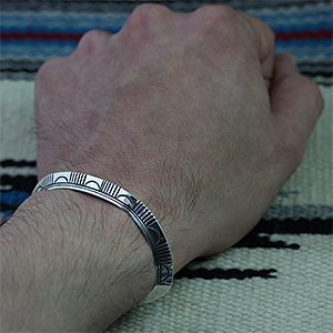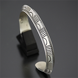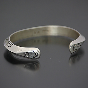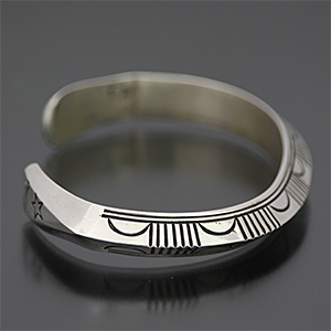 | NAVAJO/ナバホ族のアーティスト Wylie Secatero/ワイル・セカテロが制作したバングルです。 トライアングルワイヤーを用いて独自のスタンプが施されています。 スタンプを打つ時には反対側は見えませんので、バランスを考えながらスタンピングをしていきます。 スタイルを選ばない着けやすさはもちろん、インディアンジュエリーが初めての方でも気軽にお楽しみ頂けます。 | ||