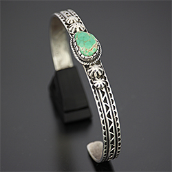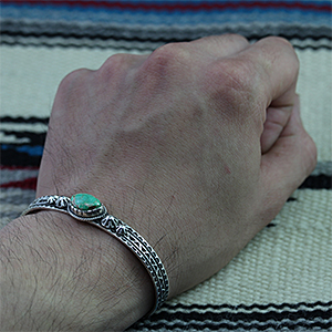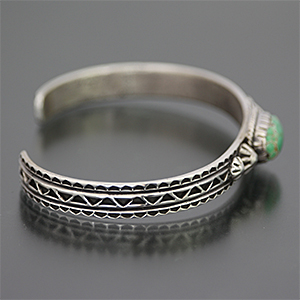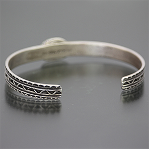 | NAVAJO/ナバホ族のアーティスト Orville White/オービル・ホワイトが制作したバングルです。 規則正しいスタンプワークが施されたトラディショナルなスタイルです。 石はモーニングスターで、コンチョに挟まれるような形でセットされています。全体のバランスがまとまっており、細身ですので着けやすさも兼ね備えています。 シンプルでスタイルを問わない作品ですので、どなたでもお楽しみ頂ける作品です。 | ||