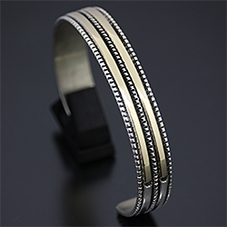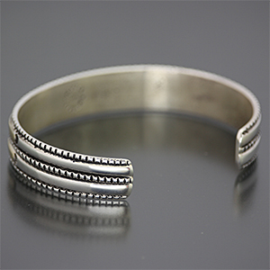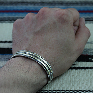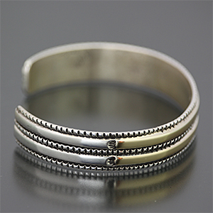 | NAVAJO/ナバホ族のアーティスト Bruce Morgan/ブルース・モーガンに制作を依頼したバングルです。 こちらはRIVER MAILの別注から生まれたチゼルワークによる作品です。 センターラインは14Kを使用しているため高級感があり、スタイルを選びませんので様々な場面でお使い頂けます。 単体でも他のバングルとの重ね着けにも相性良くお楽しみ頂けます。 | ||