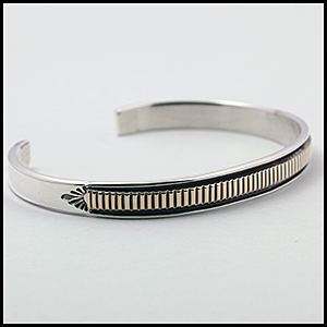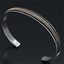 | NAVAJO/ナバホ族のアーティスト Bruce Morgan/ブルース・モーガンに制作を依頼したバングルです。 シンプルながらも深く正確なスタンプワーク、こちらは細かく規則的なストライプデザインになります。 センターラインは14Kを使用しているため高級感があり、スタイルを選びませんので様々な場面でお使い頂けます。 スタイルを選ばない着けやすさはもちろん、一点でも重ねてでも楽しめる作品です。 | ||