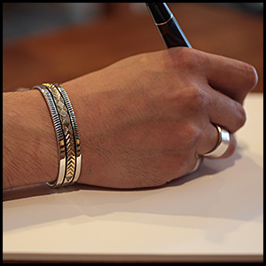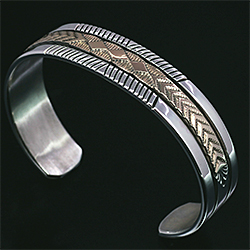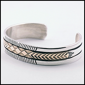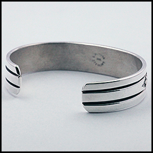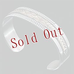 | NAVAJO/ナバホ族のアーティスト Bruce Morgan/ブルース・モーガンに制作を依頼したバングルです。 シンプルながらも深く正確なスタンプワーク、こちらは3ダイヤ/アローデザインになります。 センターラインは14Kを使用しているため高級感があり、スタイルを選びませんので様々な場面でお使い頂けます。 単体でも他のバングルとの重ね着けにも相性良くお楽しみ頂けます。 | ||