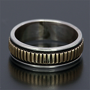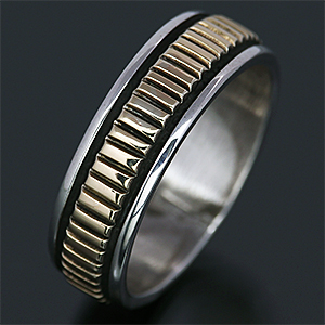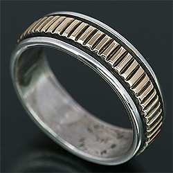 | NAVAJO/ナバホ族のアーティスト Bruce Morgan/ブルース・モーガンに制作依頼をしたリングです。 シンプルながらも深く正確なスタンプワーク、こちらは細かく規則的なストライプデザインになります。 センターは14Kを使用しているため高級感があり、スタイルを選びませんので様々な場面でお使い頂けます。 他のリングとの相性も抜群です。 | ||