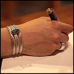 | NAVAJO/ナバホ族のアーティスト Darryl Dean Begay/ダリル・ディーン・ビゲイに制作を依頼したバングルです。 トゥーファーストーンによる素朴な風合いが印象的です。 美しい光沢に映える石はキャンデラリアで、ベゼルは18Kになります。 | ||
