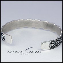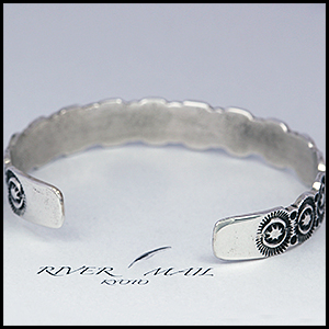 | NAVAJO/ナバホ族のアーティスト Kevin Ramone/ケビン・ラモーンが制作したバングルです。 スタンプが施されているスタンダードな作品です。 マルチにお使い頂ける一本ですので、単体でも他のバングルとの重ね着けにも相性良くお楽しみ頂けます。 | ||