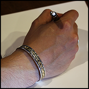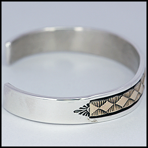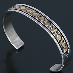 | NAVAJO/ナバホ族のアーティスト Bruce Morgan/ブルース・モーガンに制作を依頼したバングルです。 シンプルながらも深く正確なスタンプワーク、こちらのデザインはダイヤにります。 センターラインは14Kを使用しているため高級感があり、スタイルを選びませんので様々な場面でお使い頂けます。 単体でも他のバングルとの重ね着けにも相性良くお楽しみ頂けます。 | ||