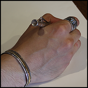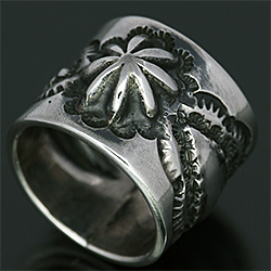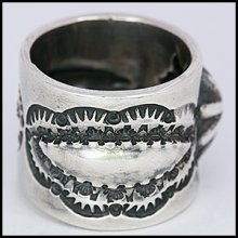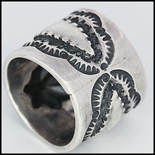 | NAVAJO/ナバホ族のアーティスト Sunshine Reeves/サンシャイン・リーブスに制作を依頼したリングです。 両サイドは裏側からコツコツと叩きだしており、中心は凹凸のスタンプを使用しています。裏側から見るとその様子がよく分かります。 力強さと昔さらしを醸し出しており、使い込むほどより風合いを増していきます。 オールド感漂うリングです。 | ||