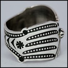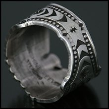 | NAVAJO/ナバホ族のアーティスト Sunshine Reeves/サンシャイン・リーブスに制作を依頼したリングです。 リングの形状はイーグルの形になっており、スタンプワークとコンチョをセットして頂いています。 限られた中で表現されたイーグルは、力強さとどこか柔らかさを感じる作品に仕上がっています。 | ||