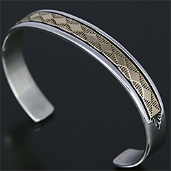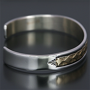| NAVAJO/ナバホ族のアーティスト Bruce Morgan/ブルース・モーガンに制作を依頼したバングルです。 シンプルながらも深く正確なスタンプワーク、こちらのデザインはダイヤにります。 センターラインは14Kを使用しているため高級感があり、スタイルを選びませんので様々な場面でお使い頂けます。 単体でも他のバングルとの重ね着けにも相性良くお楽しみ頂けます。 | ||