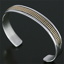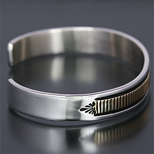 | NAVAJO/ナバホ族のアーティスト Bruce Morgan/ブルース・モーガンに制作を依頼したバングルです。 シンプルながらも深く正確なスタンプワーク、こちらのデザインはストライプになります。 センターラインは14Kを使用しているため高級感があり、スタイルを選びませんので様々な場面でお使い頂けます。 単体でも他のバングルとの重ね着けにも相性良くお楽しみ頂けます。 | ||