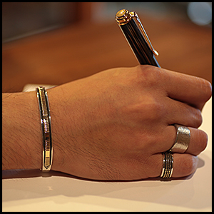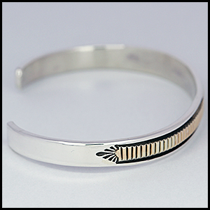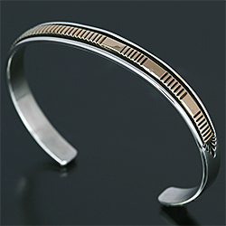 | NAVAJO/ナバホ族のアーティスト Bruce Morgan/ブルース・モーガンに制作を依頼したバングルです。 シンプルながらも深く正確なスタンプワーク、こちらはストライプ+プレーン(アシンメトリー)デザインになります。 センターラインは14Kを使用しているため高級感があり、スタイルを選びませんので様々な場面でお使い頂けます。 単体でも他のバングルとの重ね着けにも相性良くお楽しみ頂けます。 | ||