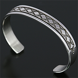 | NAVAJO/ナバホ族のアーティスト Bruce Morgan/ブルース・モーガンに制作を依頼したバングルです。 シンプルながらも深く正確なスタンプワーク、こちらのデザインはダイヤになります。 スタイルを選ばない着けやすさはもちろん、インディアンジュエリーが初めての方でも気軽にお楽しみ頂けます。 単体でも他のバングルとの重ね着けにも相性良くお使い頂けます。 | ||