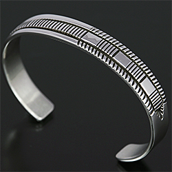 | NAVAJO/ナバホ族のアーティスト Bruce Morgan/ブルース・モーガンに制作を依頼したバングルです。 シンプルながらも深く正確なスタンプワーク、こちらのデザインはRIVER MAIL別注によるストライプ+プレーン(アシンメトリー)になります。 スタイルを選ばない着けやすさはもちろん、インディアンジュエリーが初めての方でも気軽にお楽しみ頂けます。 単体でも他のバングルとの重ね着けにも相性良くお使い頂けます。 | ||