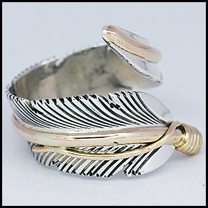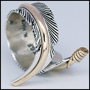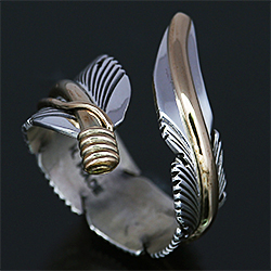 | NAVAJO/ナバホ族のアーティスト Harvey Mace/ハーヴィー・メイスに制作を依頼したリングです。 躍動感のあるフェザーモチーフのリングは、指を包み込むようなデザインに仕上がっています。 センターラインには12KGF(12金張り)が施されています。 美しい曲線と共にフェザーがしっかりとデザインされていますので、どなたでもお楽しみ頂ける作品です。 | ||